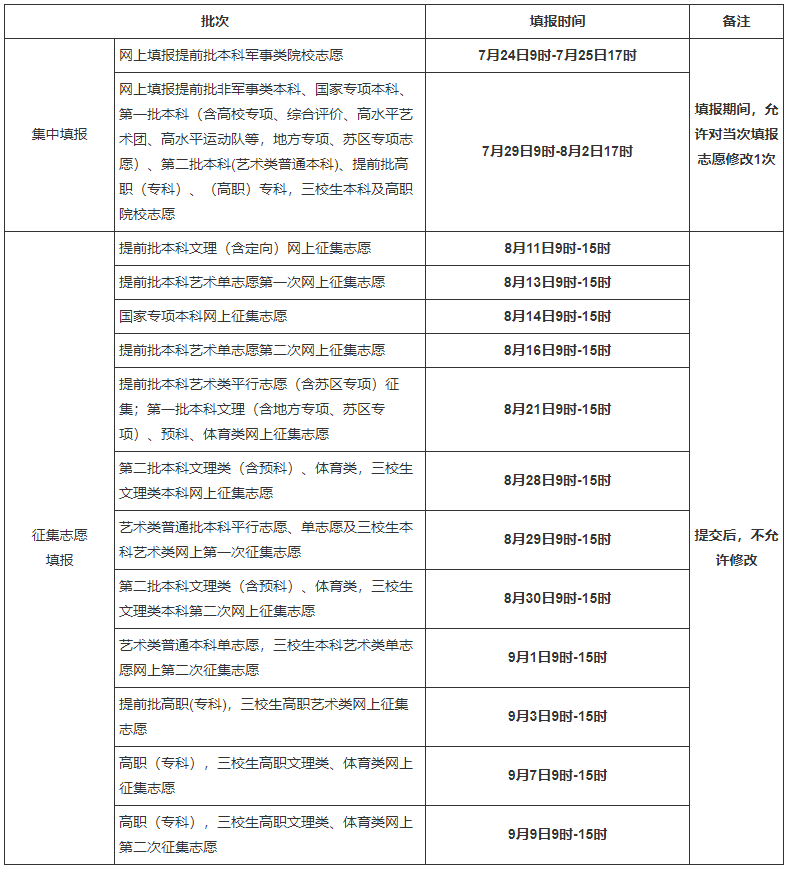 志愿填报时间:填报志愿分3个阶段进行:提前批次、单设本科批次、本科一批、普通高校职业教育单独招生志愿在7月24日12∶00至7月27日12∶00填报;本科二批志愿在本科一批录取结束后填报;高职(专科)志愿在本科二批录取结束后填报。